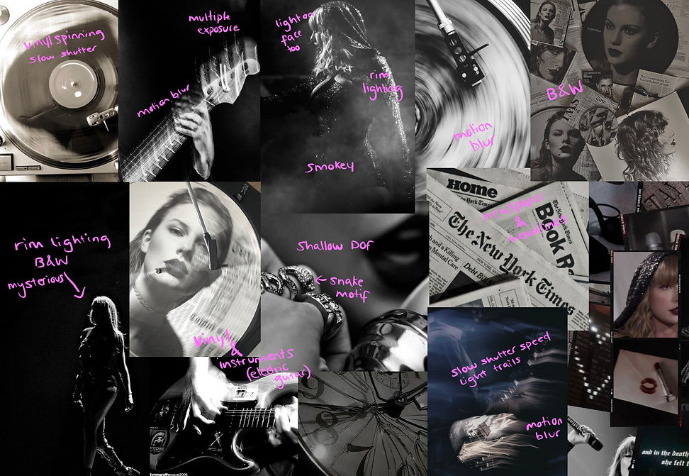 For this project, I have decided to focus on the album 'reputation'. Out of the options I considered, it's the one that makes the most sense for me creatively and realistically. The aesthetic is sharp, controlled, and studio based, with a limited range of props and motifs - snakes, newspaper, black and white palettes, and harsh shadows. I won't need elaborate sets or any other locations to make it work whereas, some of the other options were heavily location based which wouldn't have aligned with this project.