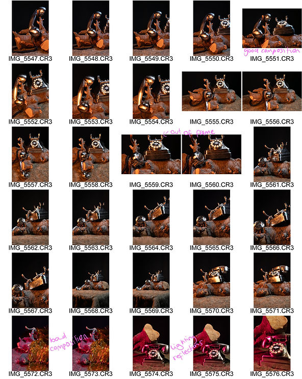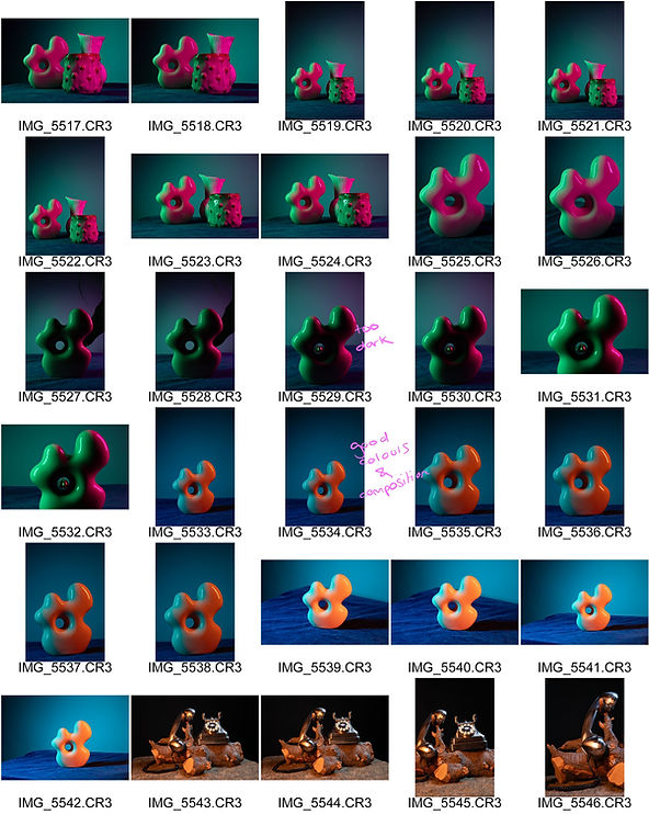 For this shoot I experimented with different techniques for shooting still life in the studio, including a range of lighting techniques like, silhouette, rim lighting, butterfly, and split lighting. Using a variety of props including ceramics, telephones, wood, vases and flowers, and fairy lights, I experimented with how light effects their appearance and which techniques work best for their shape, colour, and size. I particularly like the images where I have used split lighting with two different colours on ceramics, I think the contrasting colours work well in creating dimension in the image and adding depth to the object. It was also interesting to see the effect of shadows and how their direction can change the appearance of an object. Something I struggled with was bokeh lighting, I needed a very low aperture for the foreground objects to be in focus and the lights to be blurry however, I couldn't get it low enough while also having a well exposed image, I did however, experiment with shooting just the lights and managed to achieve the bokeh effect there. I also used reflectors to try bouncing light back onto objects and I found this to be interesting as I could see how much of a difference it made when it was there as opposed to not. I was able to see the effect of the number of light sources have on an image and the additional shadows that are then created. In addition to the still life shoot, I also experimented with using strobe flash to capture movement in water. I dropped ink drops into water and captured their different colours, shapes, and patterns and I think it turned out well. It also allowed me to gain more experience using a strobe flash as that is a new technique for me.